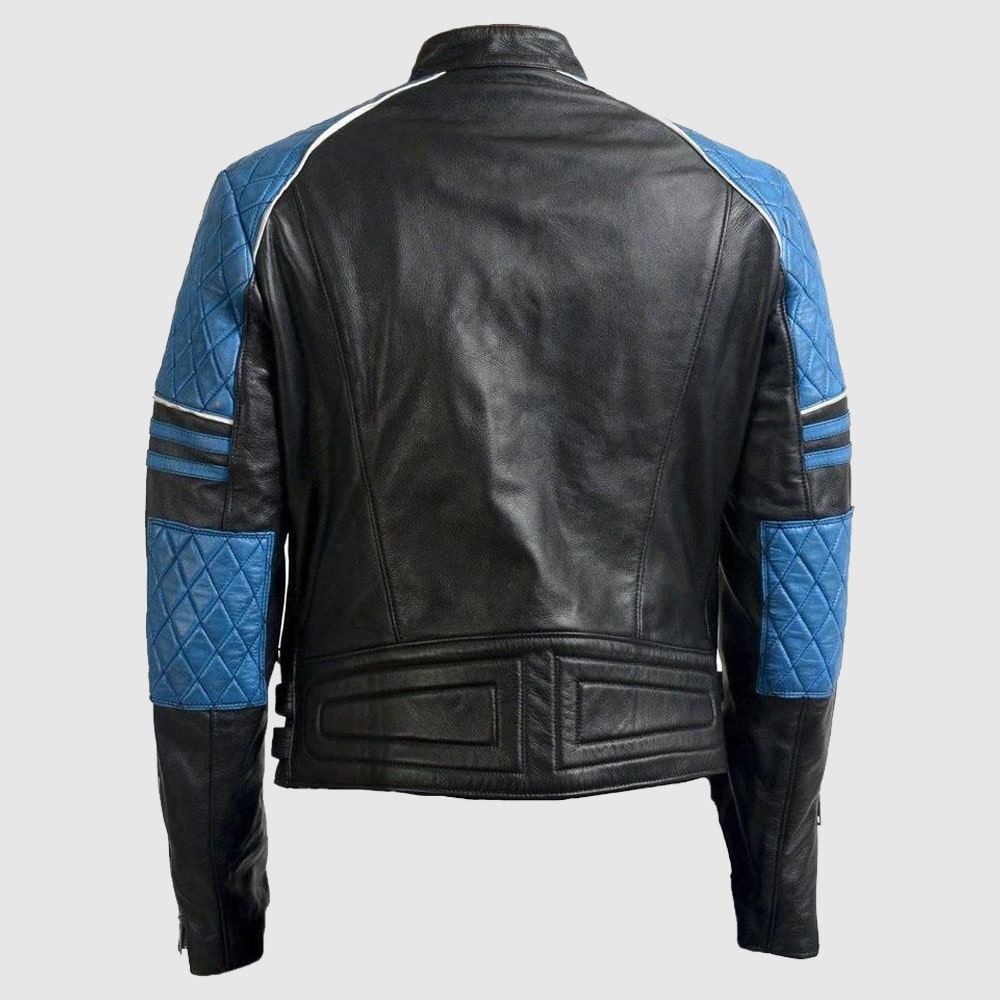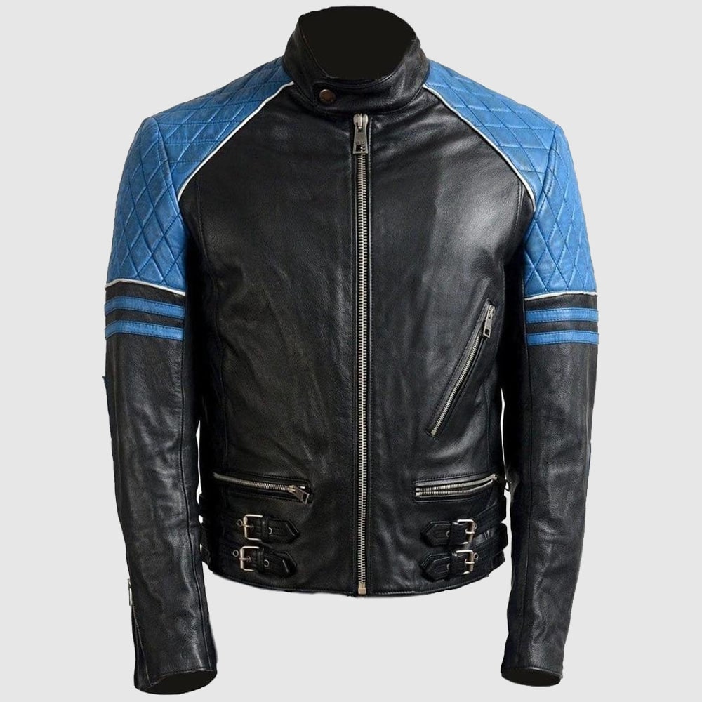 Men Blue Black Motorbike Leather Jacket, Men’s Slim Fit Leather Jacket